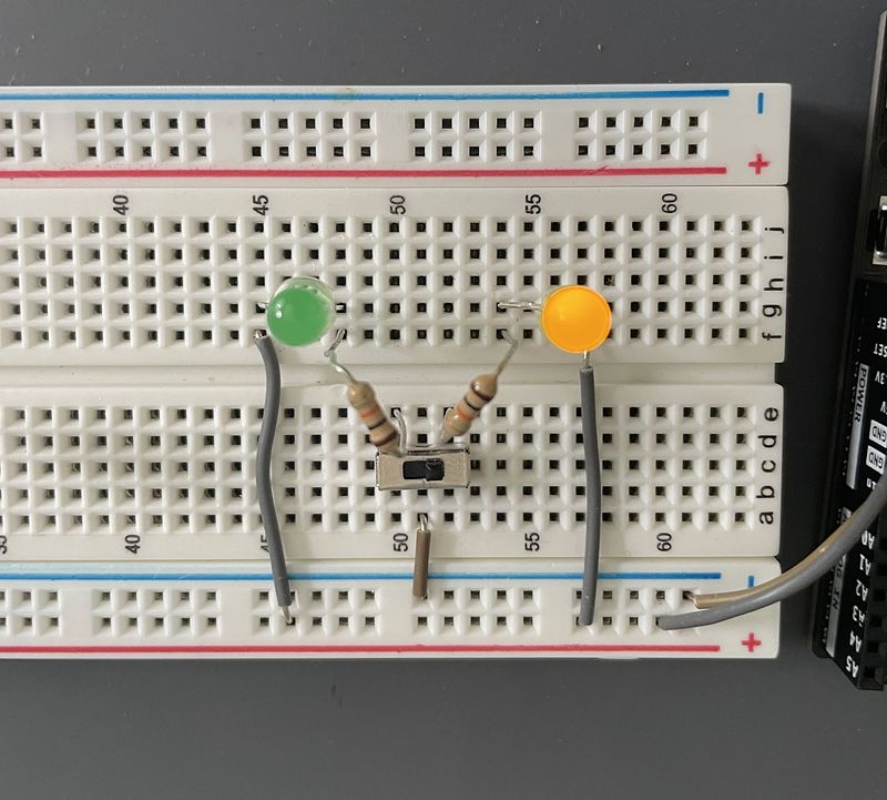 Next, connect the negative electrode of each LED to one resistor, and bring the LED positive electrode to the positive (red) rail using two jumper wires. We have essentially built two distinct circuits that split off at the 3 prong switch. When the switch is directed left, the left circuit lights up, and vice-versa.