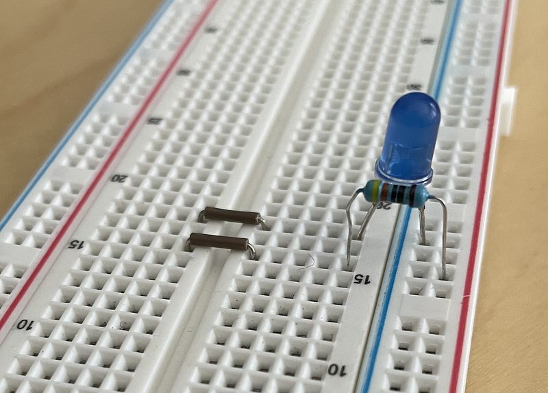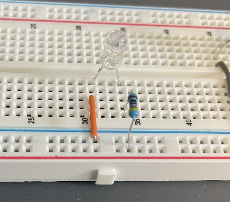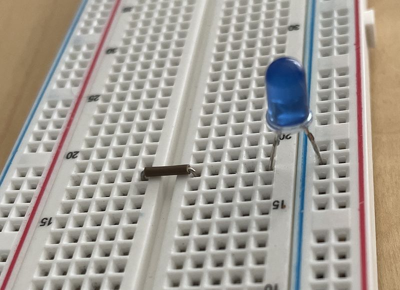 Lastly, complete the circuit by inserting one leg of the resistor into the same column as the positive electrode of your LED. The second leg of your resistor should go in the positive (red) rail. To check our circuit ensure that our components form a complete loop, starting on the positive (red) rail and ending at the negative (blue) rail.