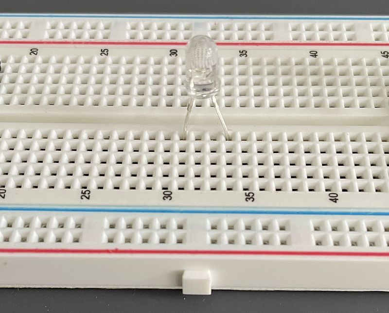 First, insert each leg of the LED into two slots on your breadboard. Power runs vertically through the breadboard, so ensure that the legs sit in different columns, as designated by the numbering.