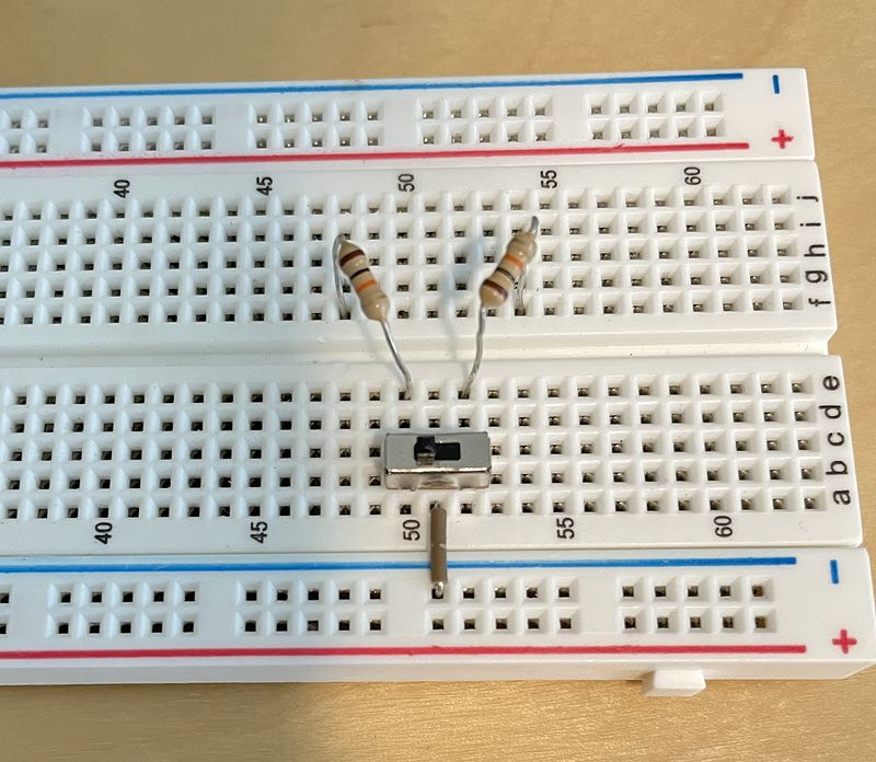 Begin building by placing the 3 prong switch on the main body of your breadboard and connecting the Input Terminal (middle pin) to the negative (blue) rail with a jumper wire. Then, connect two resistors to the left and right output pins to open up the switch for connection with an LED.